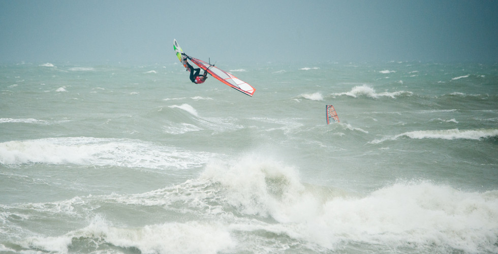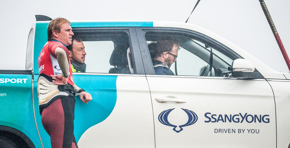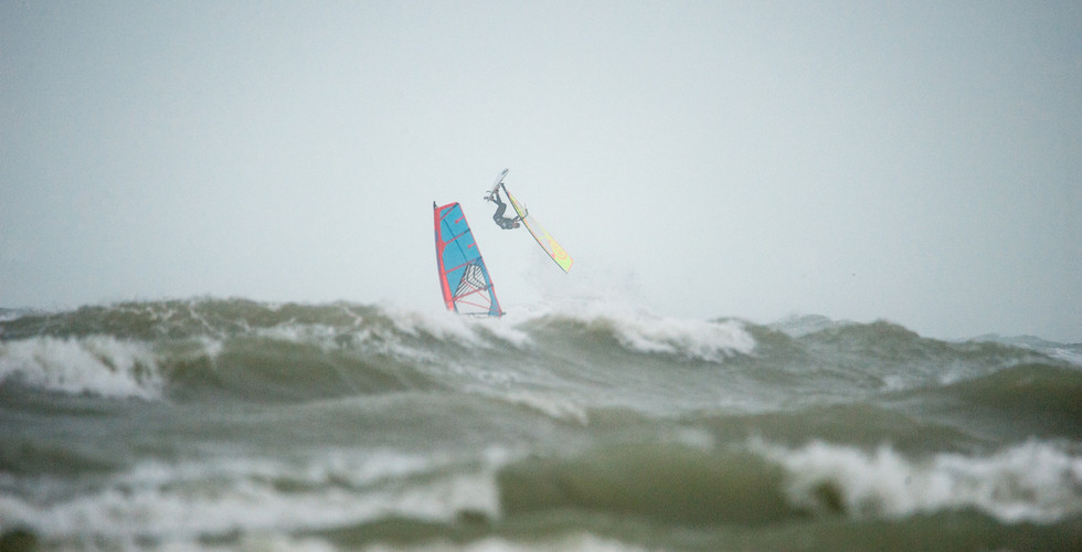 Zondag 29 september Early bird start op een downwind strand in Wimereux om 8.30 uur in de ochtend. De luxe van een WWSV jurytrailer hadden we niet meer, maar dankzij de handige handen van Nies bvba konden we makkelijk de wedstrijdvlag hanteren en jureren vanuit de auto. Het spookte buiten. De donkere wolken, wind voor een 3.7, een kolkende zee met vrij grote maar nog geen supercleane golven en af en toe een fikse regenbui zorgde voor een bepaald sfeertje onder de deelnemers. Communicatie was niet makkelijk omdat er een muur van rotsen tussen de deelnemers en de jury 4X4 was.